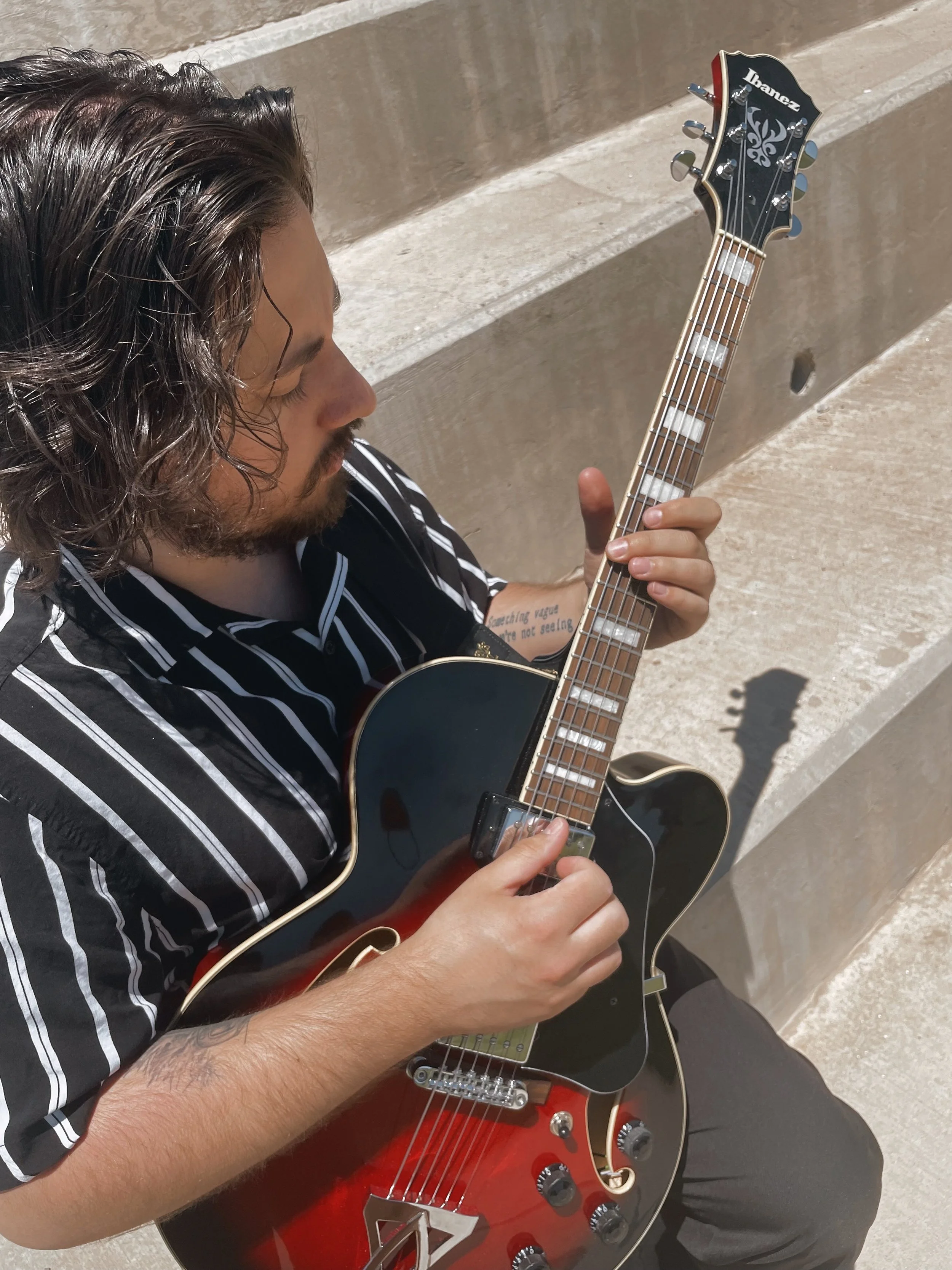Rhys Montanarello’s musical journey begin in third grade, like many young kids, wanting to learn guitar to be like his favorite musicians. Rhys spent his youth learning the music of great rock and blues guitarists like B.B. King, Angus Young, John Mayer, and Steve Vai. Alongside the guitar, he also played the cello from elementary through high school, getting experience playing classical repertoire.